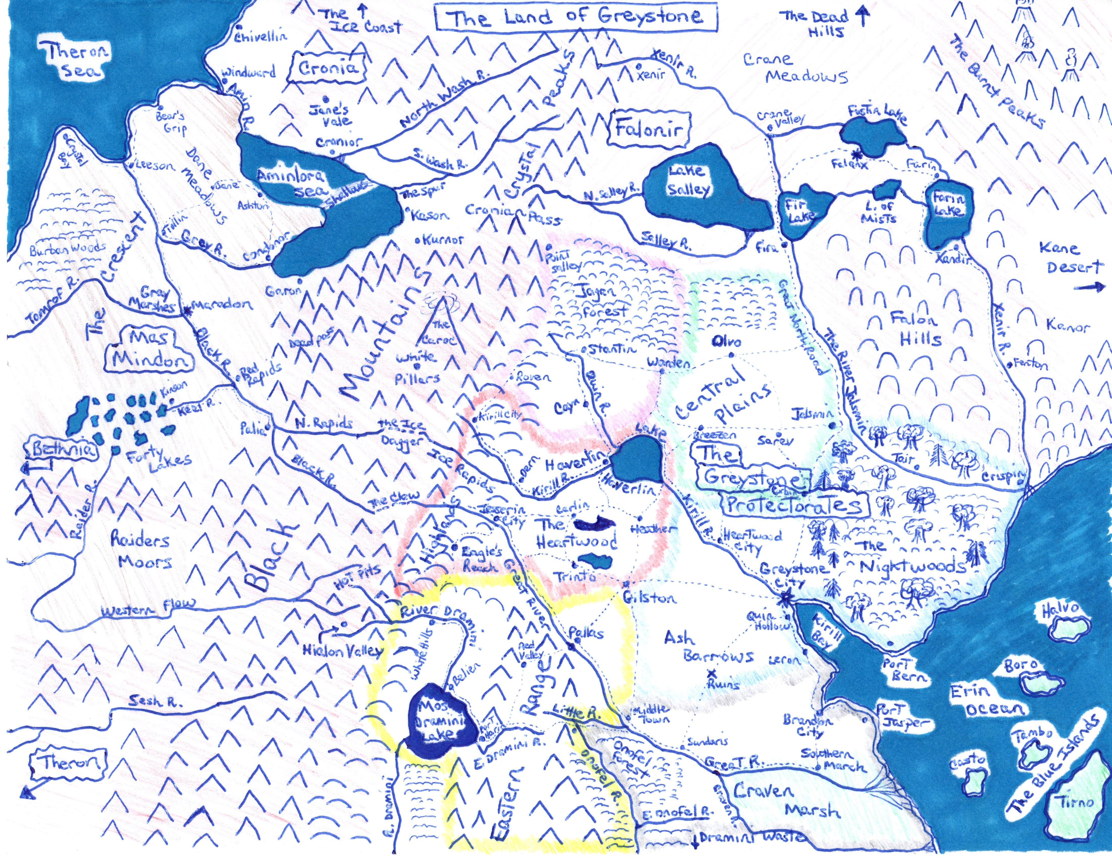 Those of you that know me are familiar with the truth that I am no artist. BUT… a fantasy story is a non-starter without a map. One of the first things I did over a year ago was sketch a map of the known Land of Greystone to begin framing the story’s locations. Back in January I made a much more detailed, fancy version. Last week, I broke out the crayolas and scratched out the “final” map below. It’s not overly neat and is overly cluttered, but it gets the job done for now!